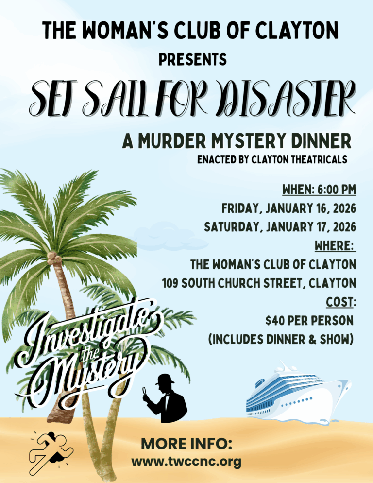 The Woman’s Club of Clayton will hold their very popular Murder Mystery Dinner in January 2026. Will be joined by Clayton Theatricals, who will enact the deadly deed.